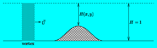 In this picture, H(x,y) represents the fluid depth, which by default is H=1 (in dimensionless units). Suppose now that a vortex approaches the ridge: what happens to it?