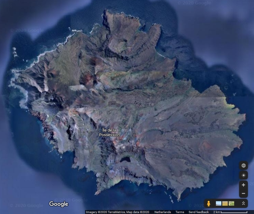 De Pocketatlas heeft een mooi kaartje van Île de la Possession, maar niet van een zodanige grootte dat het makkelijk scanbaar is; bovendien zit er ongetwijfeld copyright aan vast. Daarom heb ik gezocht naar een vrij beschikbare kaart [4] en een screenshot gemaakt van het satellietbeeld dat Google Maps geeft.