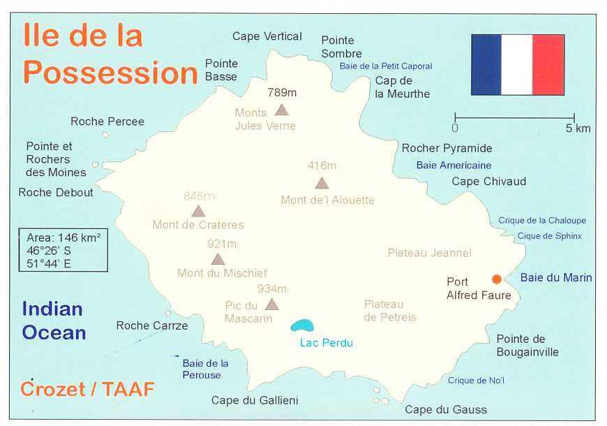 Het Île de la Possession (= "eiland van het bezit"; oorspronkelijk Île de la Prise de Possession = "eiland van de inbezitneming") ligt zo'n 2370 km ten zuiden van Madagaskar, op 46°24' ZB en 51°45' OL, en maakt deel uit van de Franse subantarctisch Crozeteilanden. Het eiland is 150 km² groot en onbewoond, op de 20-40 medewerkers van het onderzoeksstation Alfred Faure (genoemd naar de leider van het station toen dat in 1961 werd opgericht). Uit de gegevens van dat station blijkt dat de gemiddelde temperatuur op het eiland 5.3° is; de hoogst en laagst gemeten temperaturen zijn 22.4° en -6.6°. Jaarlijks valt er gemiddeld 1782 mm regen en regent het gemiddeld op 173 dagen meer dan 1 mm. Het eiland is een "Important Bird and Biodiversity Area (IBA)", met broedplaatsen van tenminste 26 soorten vogels [2].