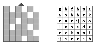 y" hierboven in het boek de combinatie "ij" is en een enkele letter voorstelt (Elsevier vertaalde de boodschap in het Nederlands). Deze gecodeerde boodschap is ontstaan uit een reguliere tekst met behulp van een 6-bij-6 rooster. In hoofdstuk vier wordt dat rooster gevonden en het ziet eruit zoals hieronder is weergegeven: een vierkant van 6-bij-6 vakjes met daarin 9 openingen, en aan een zijde een markering.