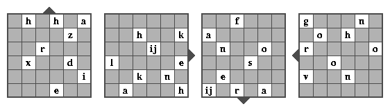 hfgnhk aldnne telkni hyazao aetsae neavts nhorlr nzetsp eihssy soexkd lsloan peegtt nieyor naluez saorla vnahea irelmt laredaOm een bruikbaar 6-bij-6 rooster te hebben moeten de 9 openingen zodanig verdeeld zijn dat na viermaal draaien alle 36 vakjes precies eenmaal aan de beurt zijn geweest. Zoals gezegd levert dat voor de 9 openingen in het 6-bij-6 rooster in totaal 262.144 mogelijkheden op. Een 4-bij-4 rooster (met 4 openingen) heeft slechts 256 mogelijkenheden, terwijl een 8-bij-8 rooster (met 16 openingen) meer dan 4 miljard mogelijkheden heeft. Ook een vierkant rooster met een oneven aantal vakjes per zijde is uiteraard mogelijk, waarbij het middelste vakje niet gebruikt wordt.