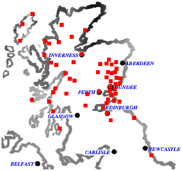 On my Web pages you can find a number of photos taken in Scotland. Click on one of the red squares on the map below to go to a page (ca. 60 kb) where you can find a photo taken in that area; the status line of your browser shows what area the square refers to.