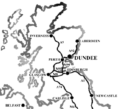 It is a part of a full map (46kb) of Britain, which I retreived from a Web site of the University of Dundee. The maps show only the major cities and roads in the UK; a map showing more places and roads in the UK is available through the PCL Map Collection.
